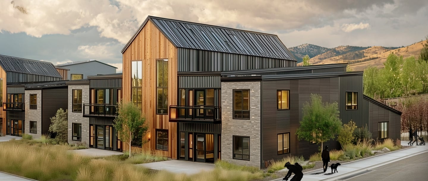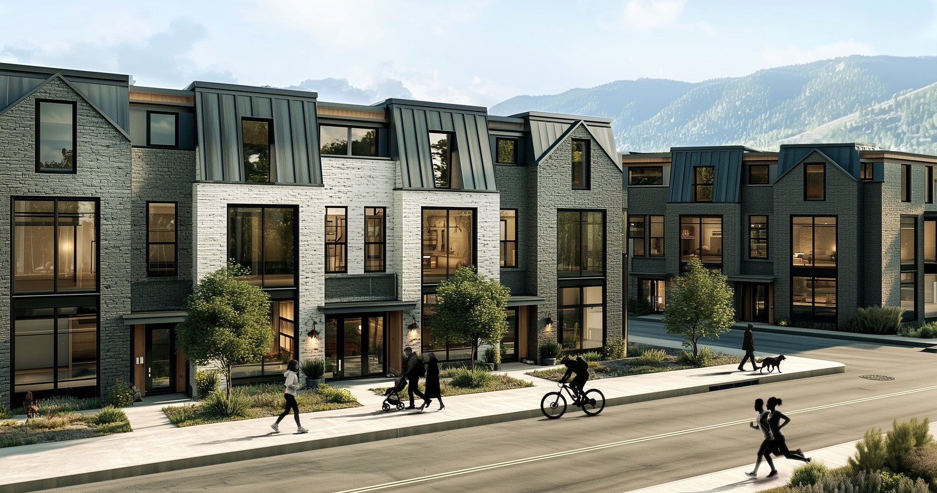 The project utilizes a multi-zoned approach to create a logical and functional transition from the commercial corridors to the residential areas: